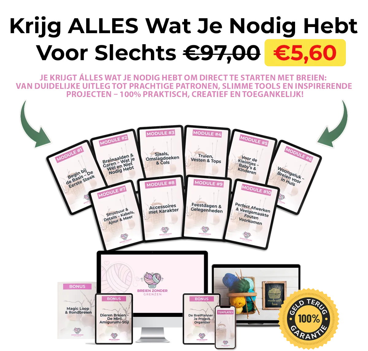 Ik snap het helemaal: voordat je aan iets nieuws begint, wil je weten wat je krijgt én dat je geen risico loopt. Zelfs als het maar €5,60 is. Mijn oma zei altijd: "Voel eerst het garen voordat je de trui breit." Daarom hebben we dit geregeld: je krijgt volledige toegang tot de hele Breien Zonder Grenzen Bundel en je mag alles uitproberen.