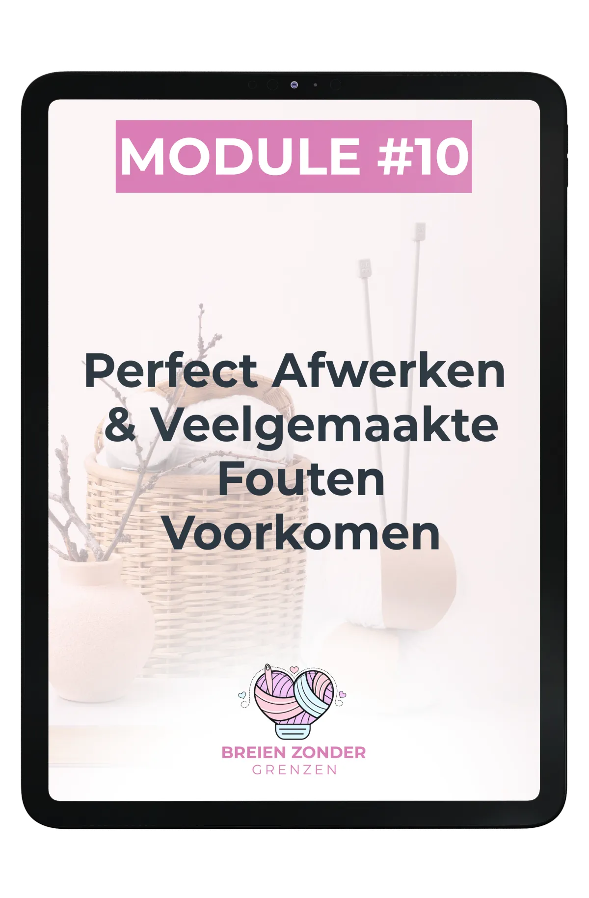 Deze module geeft je alles wat je nodig hebt om je breiwerk professioneel af te ronden. Van afhechten tot draadjes wegwerken en foutjes herstellen en checklists. Je leert precies hoe je van een goed project een écht afgewerkt meesterwerk maakt. Dit is de geheime stap waar je breiwerk écht van opbloeit.